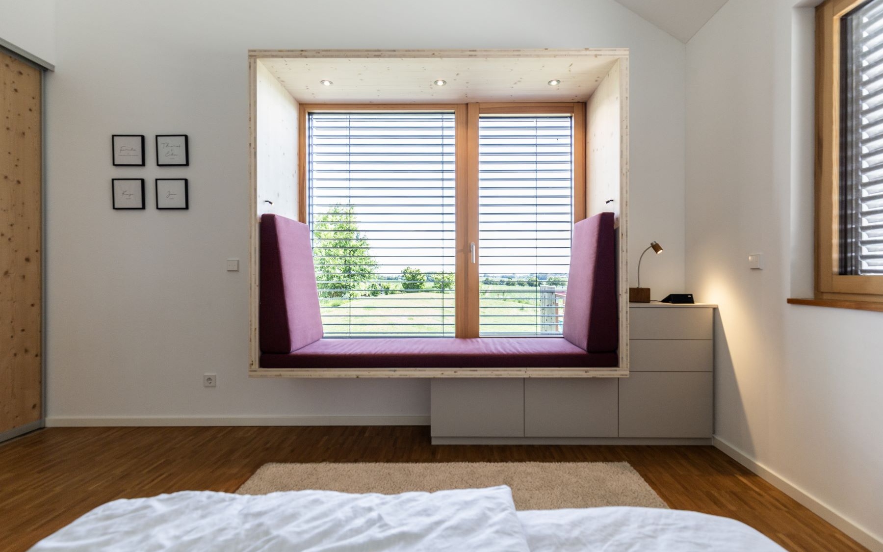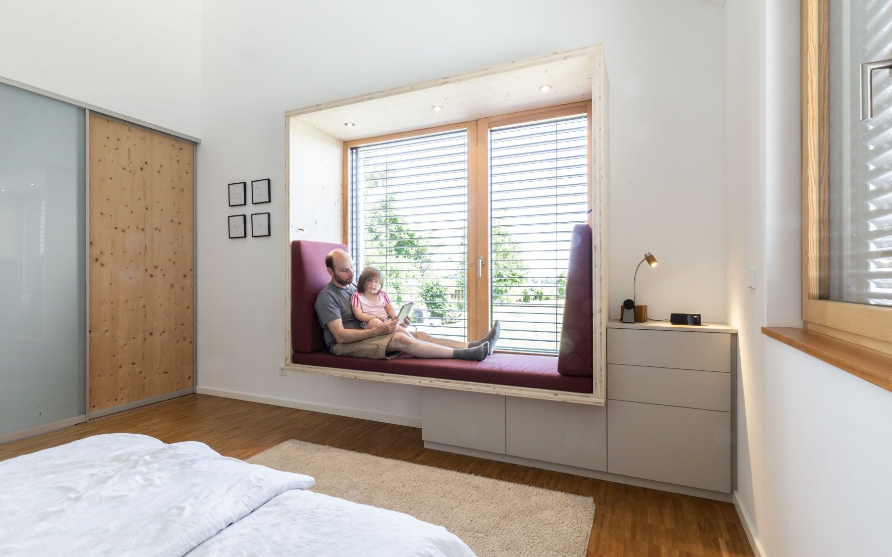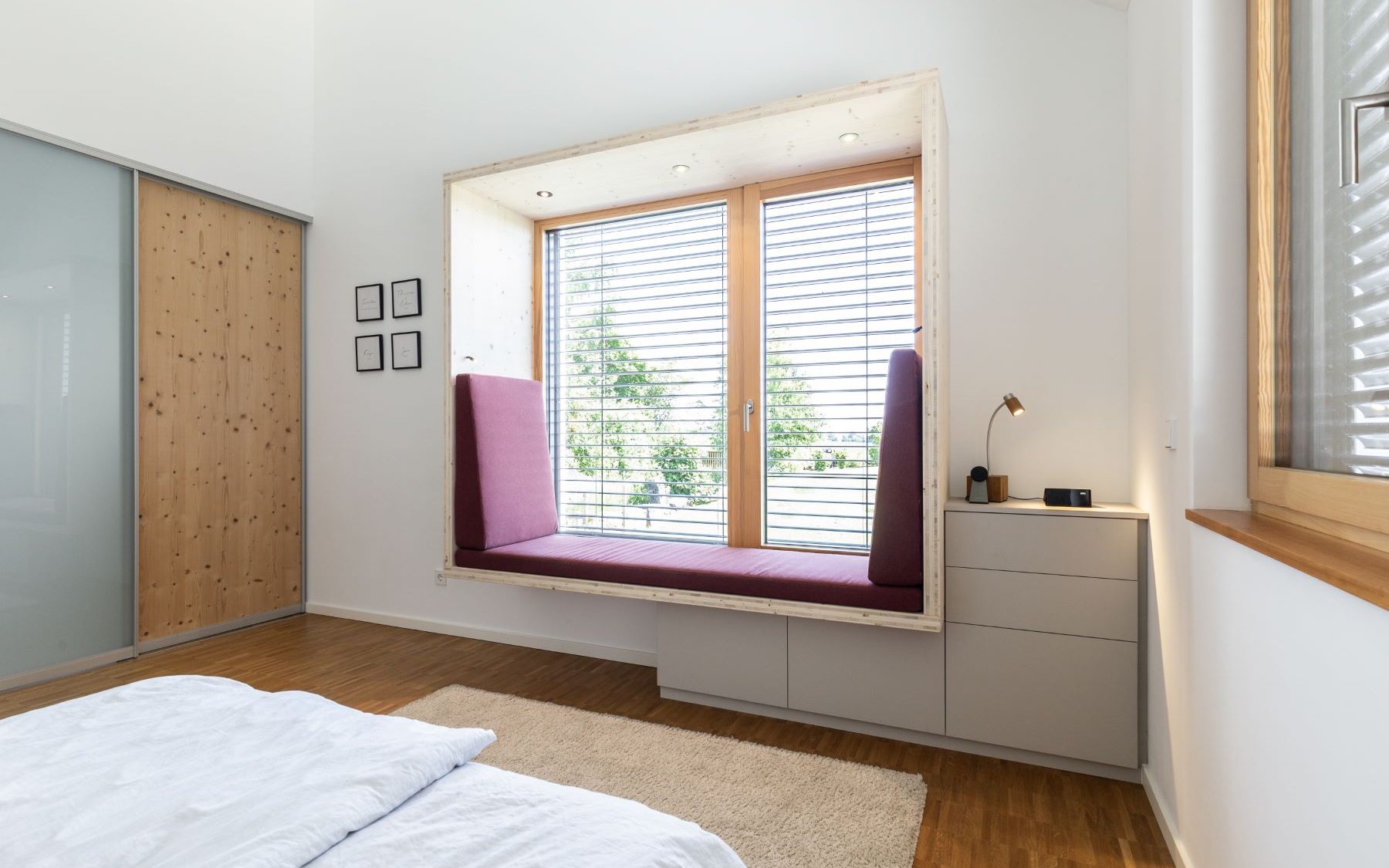 Die in hellem Holz ausgeführte Nische rahmt das Fenster wie ein Möbelstück und betont zugleich den Blick ins Freie. Durch die klare Formensprache und die reduzierten Materialien entsteht ein zeitloses Design, das Ruhe in den Raum bringt und dennoch einen gestalterischen Akzent setzt.